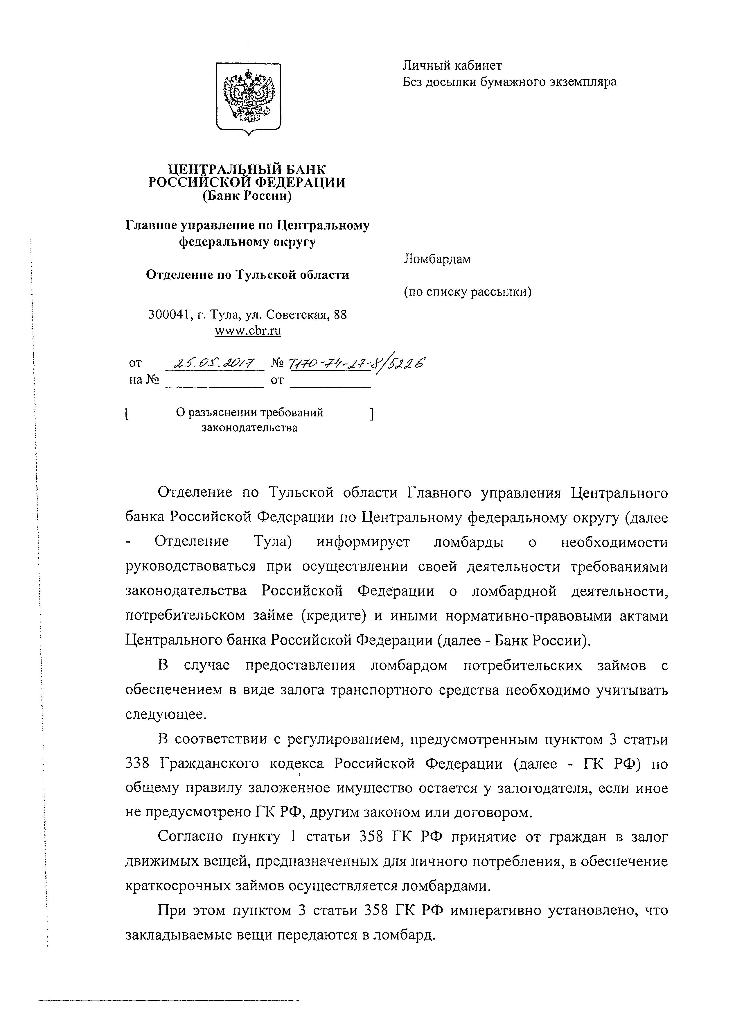 Отделение по Тульской области Главного управления Центрального банка Российской Федерации по Центральному федеральному округу (далее - Отделение Тула) информирует ломбарды о необходимости руководствоваться при осуществлении своей деятельности требованиями законодательства Российской Федерации о ломбардной деятельности, потребительском займе (кредите) и иными нормативно-правовыми актами Центрального банка Российской Федерации (далее - Банк России). В случае предоставления ломбардом потребительских займов с обеспечением в виде залога транспортного средства необходимо учитывать следующее. В соответствии с регулированием, предусмотренным пунктом 3 статьи 338 Гражданского кодекса Российской Федерации (далее - ГК РФ) по общему правилу заложенное имущество остается у залогодателя, если иное не предусмотрено ГК РФ, другим законом или договором. Согласно пункту 1 статьи 358 ГК РФ принятие от граждан в залог движимых вещей, предназначенных для личного потребления, в обеспечение краткосрочных займов осуществляется ломбардами. При этом пунктом 3 статьи 358 ГК РФ императивно установлено, что закладываемые вещи передаются в ломбард. В соответствии с требованиями пунктов 5 и 6 статьи 2 Федерального закона от 19.07.2007 № 196-ФЗ «О ломбардах» (далее - Закон № 196-ФЗ) ломбард не вправе пользоваться и распоряжаться заложенными и сданными на хранение вещами. В ломбарде (в каждом территориально обособленном подразделении) должны быть созданы условия для хранения заложенных и сданных на хранение вещей, обеспечивающие их сохранность, отсутствие вредных воздействий и исключающие доступ к ним посторонних лиц. Согласно пункту 2 статьи 7 Закон № 196-ФЗ договор займа совершается в письменной форме и считается заключенным с момента передачи заемщику суммы займа и передачи ломбарду закладываемой вещи. Таким образом, принимая во внимание специальное регулирование, предусмотренное Законом № 196-ФЗ, нормы которого направлены на обеспечение вышеуказанных положений ГК РФ, полагаем, что, если при заключении договора потребительского займа с обеспечением в виде залога транспортного средства автомобиль остается у залогодателя, а паспорт транспортного средства передается ломбарду», то подобное может свидетельствовать о нарушении ломбардом законодательства Российской Федерации о ломбардах.