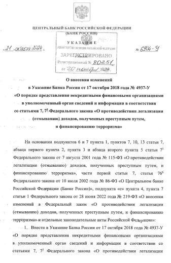 Опубликовано Указание Банка России от 21.10.2024 №6904-У «О внесении изменений в Указание Банка России от 17 октября 2018 года №4937-У «О порядке представления некредитными финансовыми организациями в уполномоченный орган сведений и информации в соответствии со статьями 7, 7.5 Федерального закона «О противодействии легализации (отмыванию) доходов, полученных преступным путем, и финансированию терроризма». Изменения в порядок предоставления сведений в Росфинмониторинг вступят в силу 8 декабря 2024.